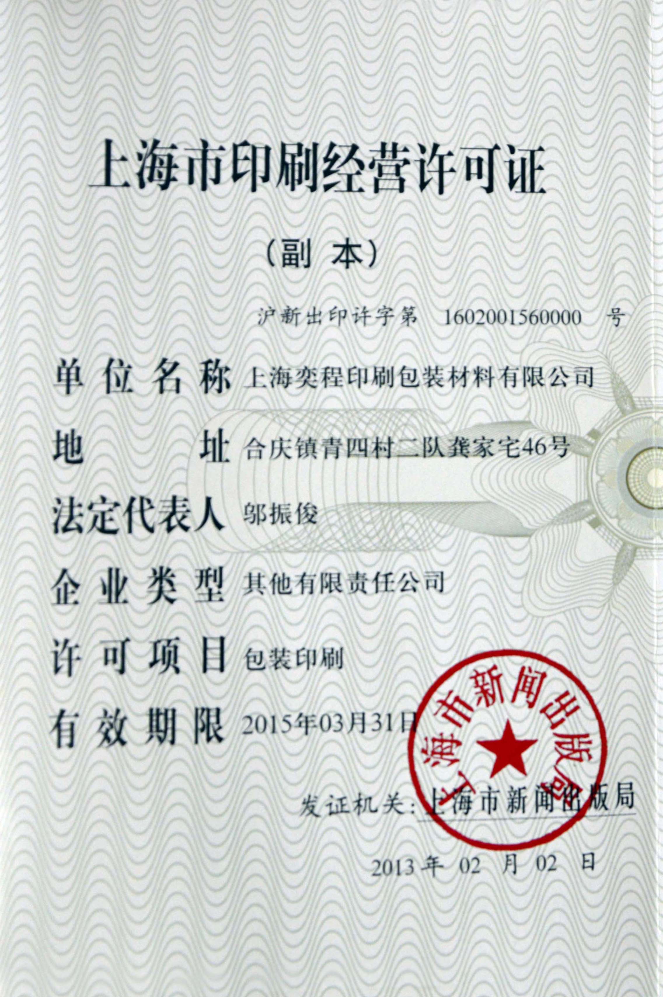 上海奕程印刷包裝材料有限公司 地址:上海浦東新區華夏東路4220號
